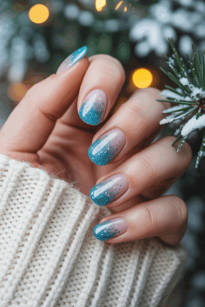Glitter gradient ombre nails use a smooth color blend with sparkling glitter. This style adds shine without overwhelming the look. It fits well for winter events or everyday wear. The glitter usually concentrates at the tips, fading into the base color for a natural effect.