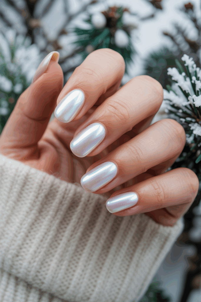 This design features a smooth pearl white base with a soft iridescent shine. The subtle glow adds depth without overpowering the look. It suits both casual and formal winter settings. The finish is glossy, giving nails a clean and polished appearance.