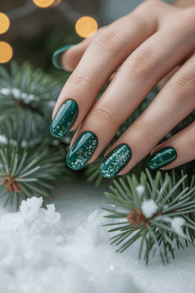 Sparkling evergreen green is a popular choice for winter acrylic nails. It blends deep green tones with glitter for a festive yet elegant look. This style works well for both casual and formal occasions during the season.