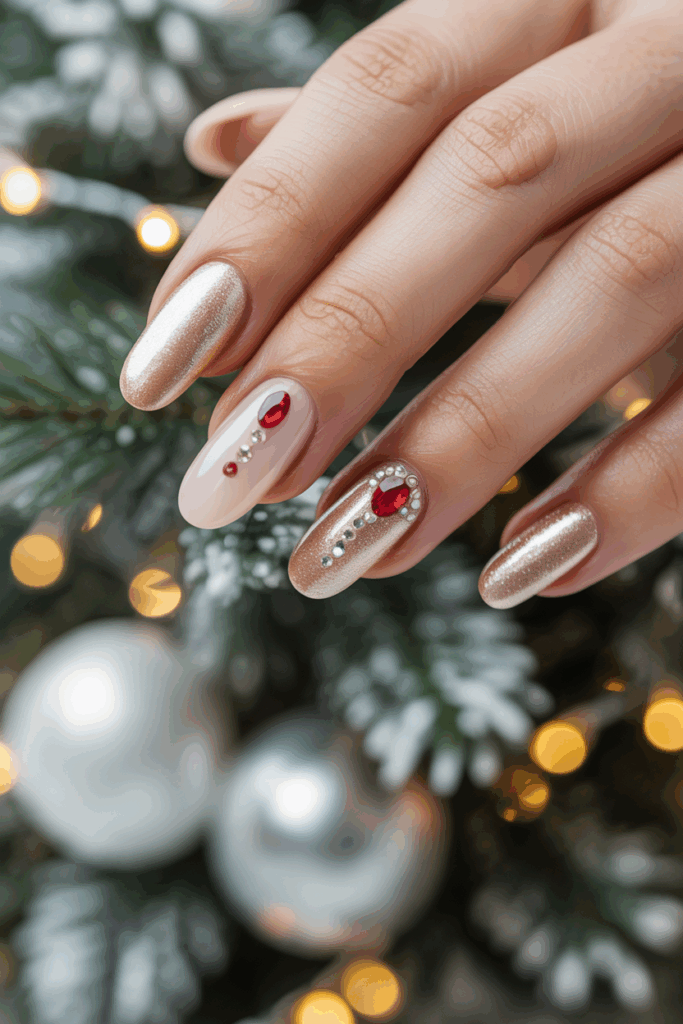 This design pairs a soft champagne gold base with bright red rhinestones. The gold offers a subtle shine, while the red stones add a festive touch.