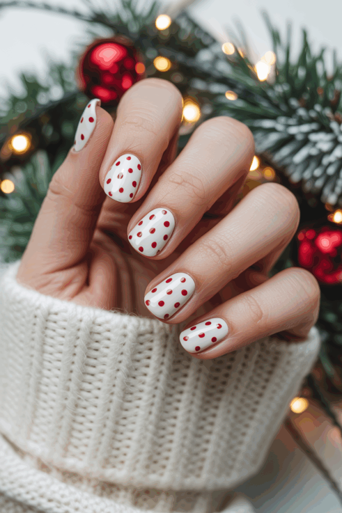 This design uses a clean white base with evenly spaced red polka dots. It mixes a simple style with a festive color scheme.