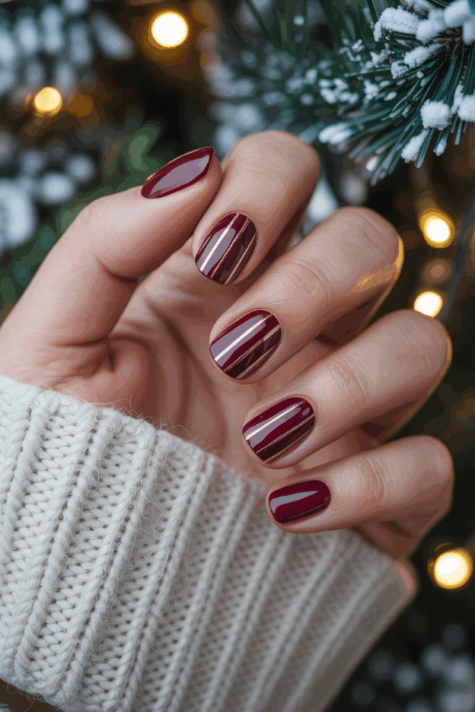 This design uses a deep burgundy base color for a rich, winter look. Thin metallic stripes add a modern and festive touch without being overwhelming. It works well on both short and long nails, making it versatile for different styles.