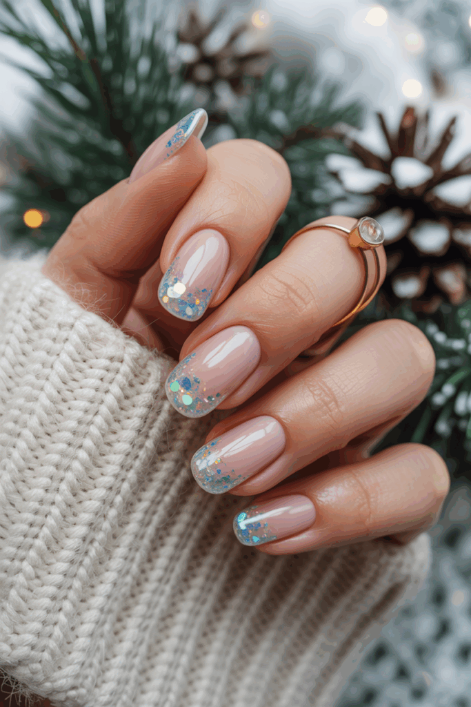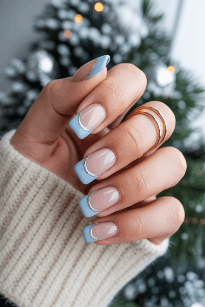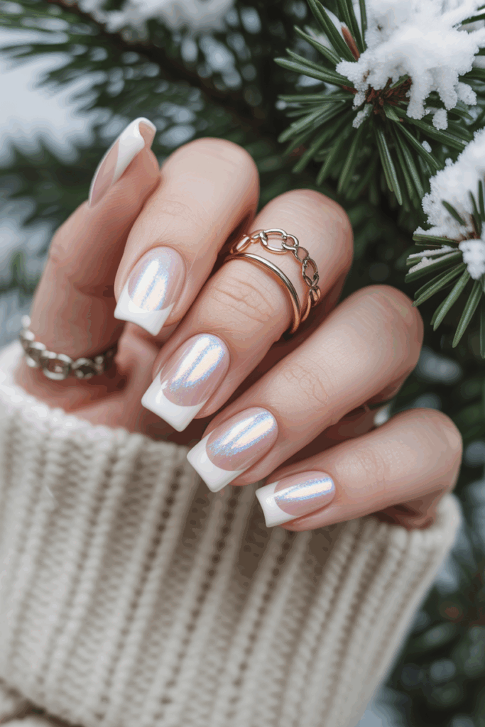 They add shine by layering iridescent glitter over classic French tips. The glitter catches light, giving nails a cool, subtle sparkle. This look fits both casual and formal winter styles. It creates a polished finish without being too bold.