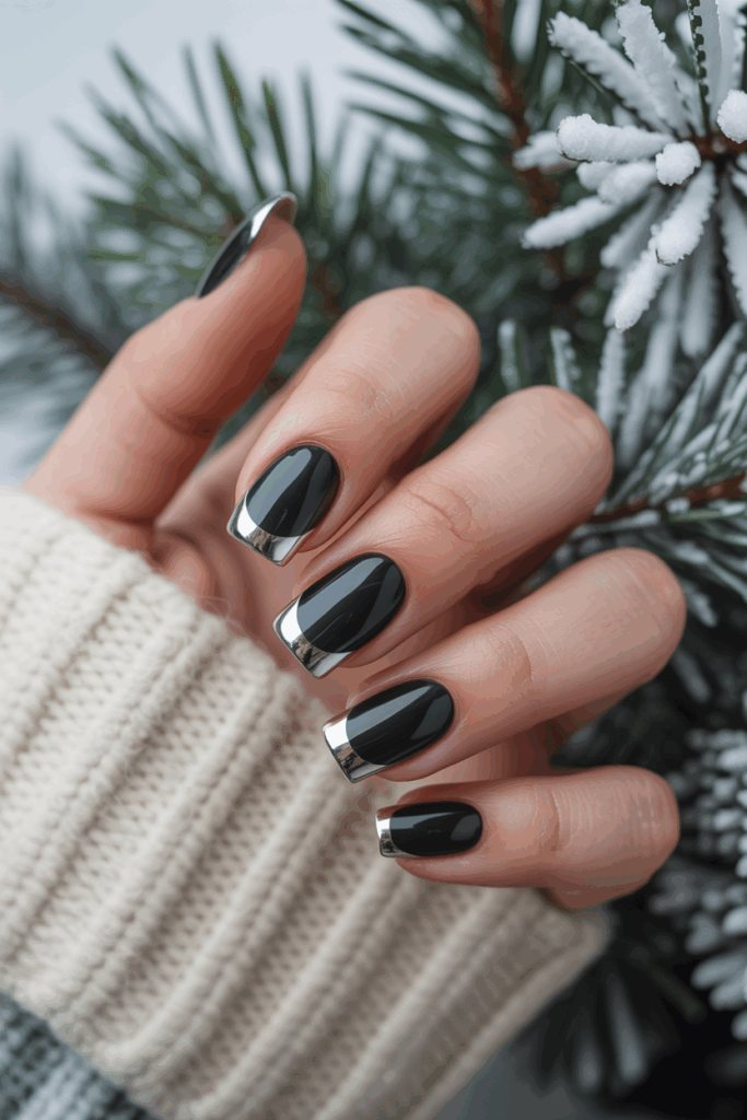 Icy chrome tips on black gel create a sharp, modern look. The dark base makes the reflective chrome stand out clearly. This design is simple yet striking for winter. It pairs well with both casual and formal styles.