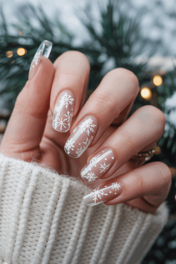 This style features transparent French tips with delicate white snowflake designs. The clear base makes the snowflakes stand out, giving a subtle and elegant winter look.