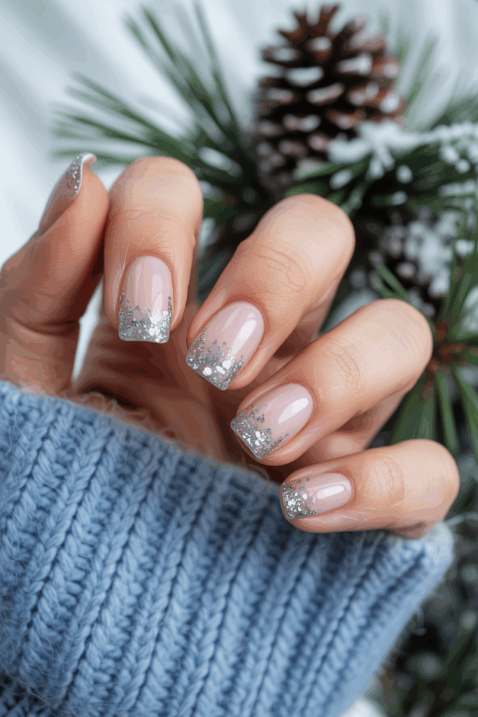Frosty silver glitter tips add a cool, sparkling touch to classic French nails. They use fine silver glitter over the white tip for a seamless shine. This look works well for winter, giving nails a polished and modern feel.