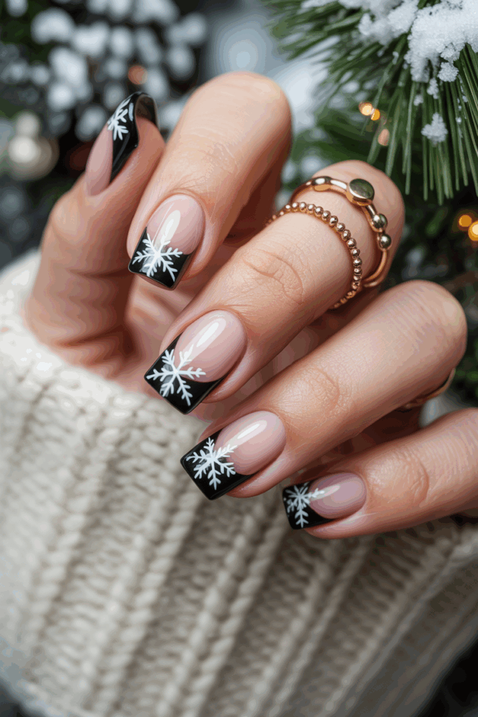 The contrast between the black gloss and delicate snowflakes creates an elegant, seasonal look.
