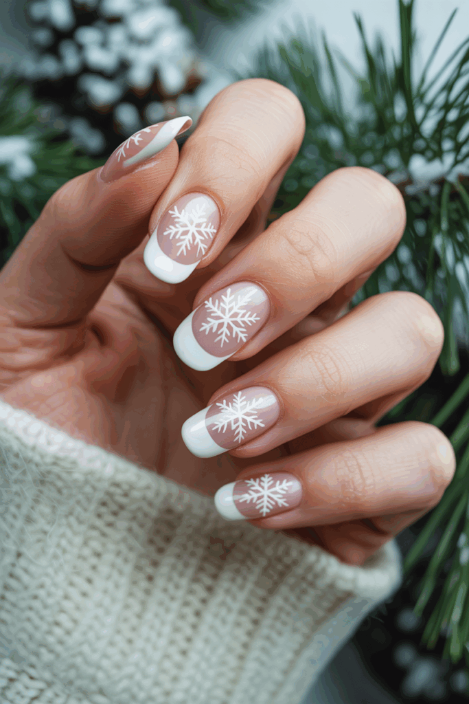 This design pairs soft matte white tips with shiny snowflake patterns. The contrast between the matte base and glossy details makes the snowflakes stand out clearly. It’s a simple yet elegant look that fits well with winter themes.