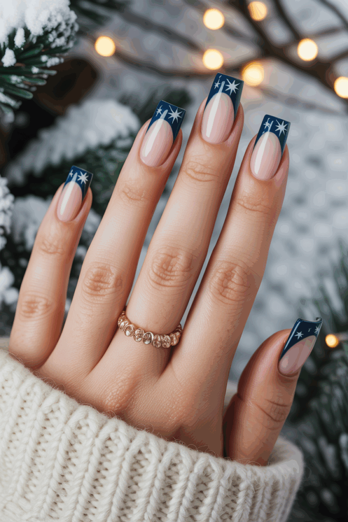 Navy blue French tips offer a clean and classic look with a deep, rich color. Adding star accents creates a subtle, stylish detail that fits well with winter themes. This combination balances simplicity with a touch of creativity. It works for both casual and formal settings.
