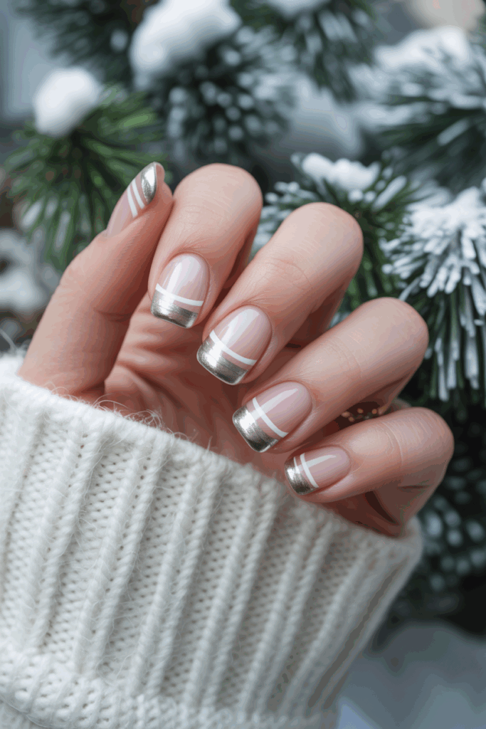 This nail design features clean white tips with slim silver stripes. It offers a modern twist on the classic French manicure. The stripes add subtle texture without overwhelming the look, making it suitable for winter style.