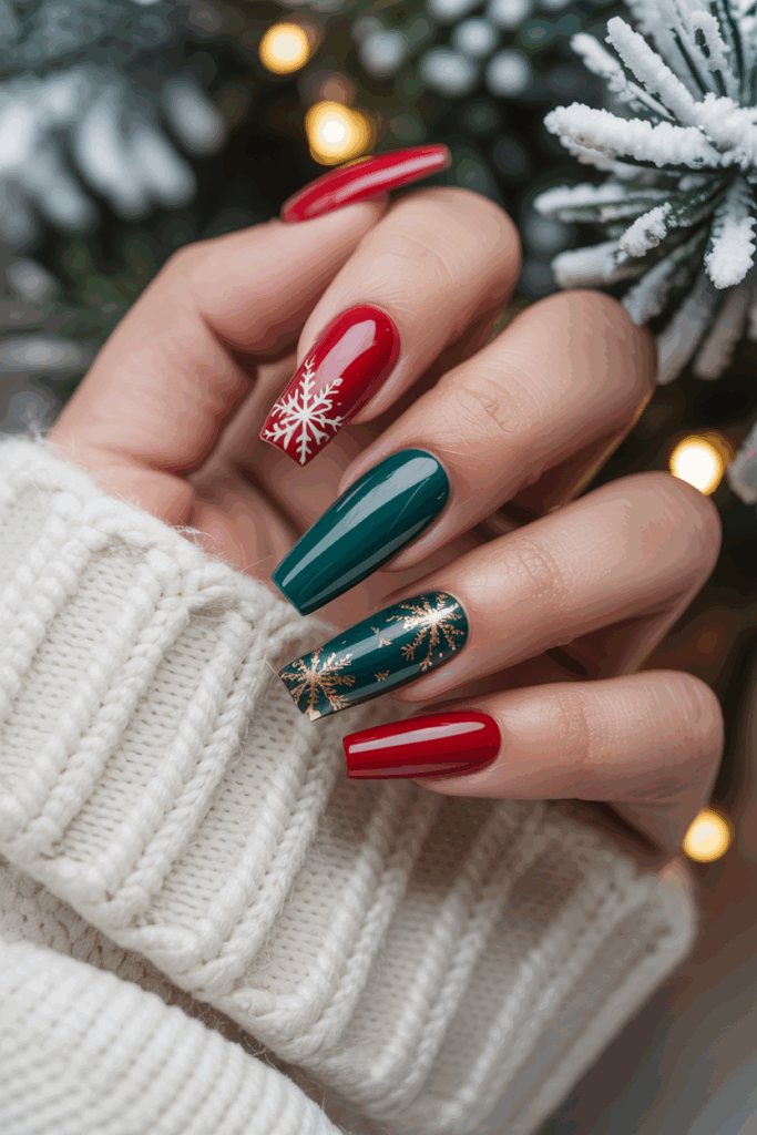 These nails combine style with holiday spirit. Many choose acrylics for durability and sharper edges during the season.