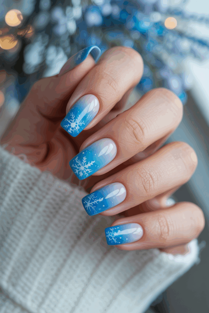 Frosty blue ombre nails blend dark blue with icy white shades. This gradient creates a smooth, cool look that fits winter themes well.