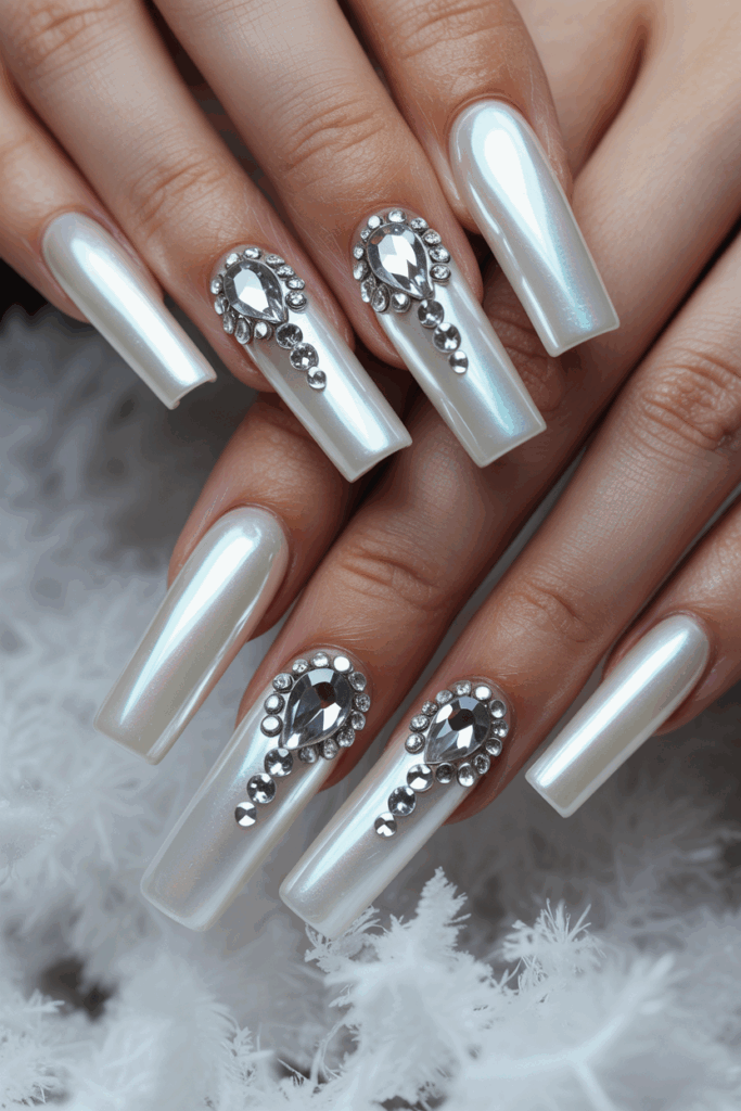 This design pairs a soft pearl white base with small rhinestone accents. The rhinestones add subtle sparkle without being too flashy. It creates a refined look that suits both casual and formal occasions. The pearl white shade feels fresh and perfect for winter.