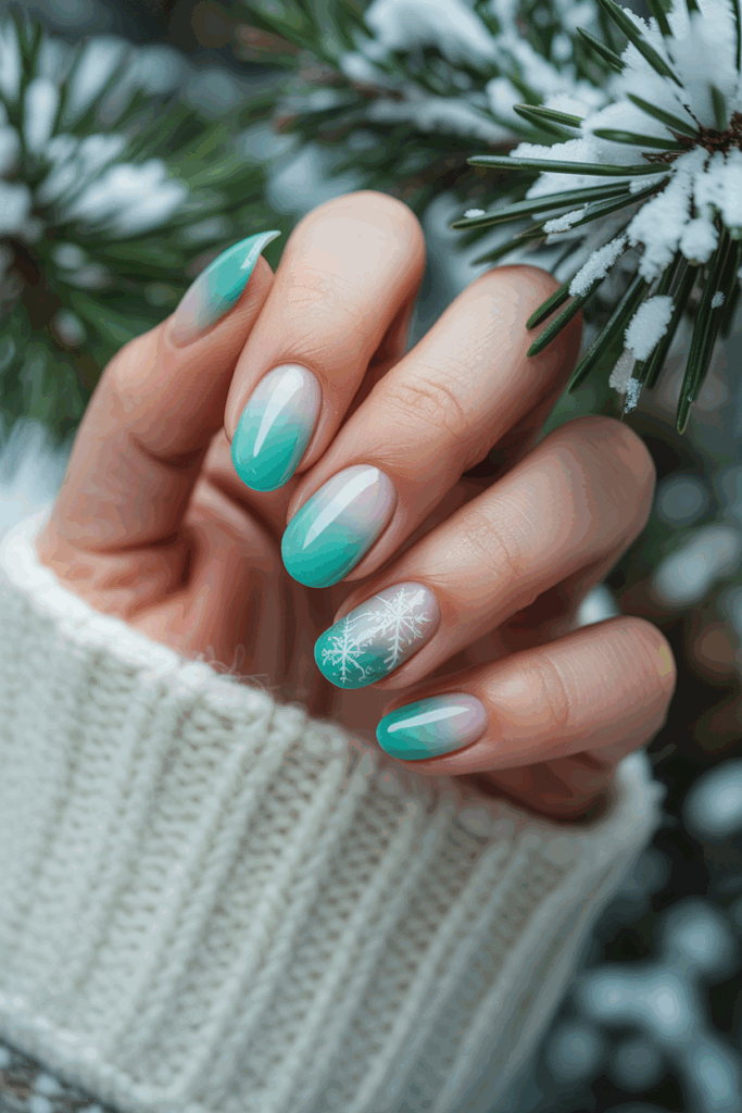 This design features a smooth blend from light mint to a deeper green shade. It creates a fresh, cool look perfect for winter. The gradient adds subtle dimension without being too bold. It works well on all nail shapes and lengths.