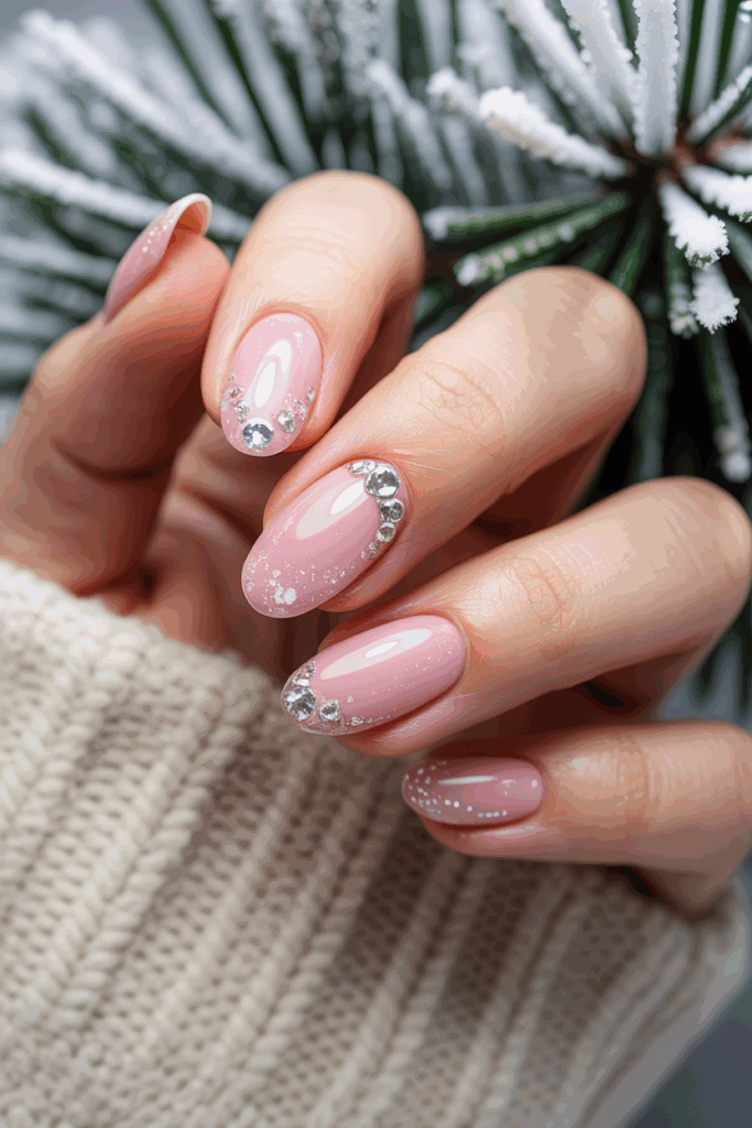 This design features a soft, frosted pink base that looks cool and elegant. Small diamond accents add a subtle sparkle without being too bold. It works well for both casual and special winter occasions. The look is simple but refined, fitting the season’s chill with a touch of shine.