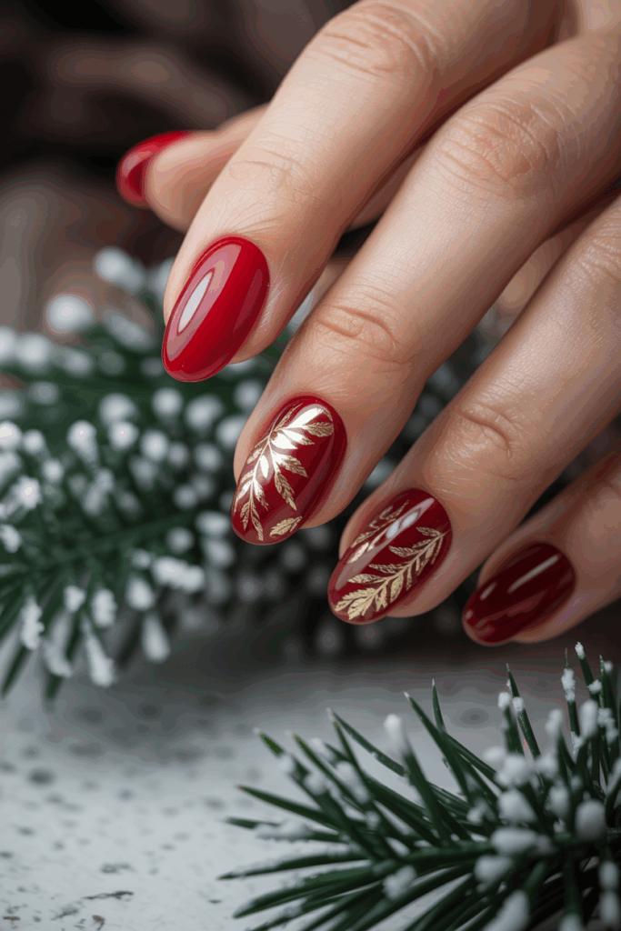 This nail design features a deep, glossy red base that looks clean and polished. Gold foil pieces are added in small patches for a subtle shine. The mix of red and gold creates a balanced, elegant look suitable for winter and festive occasions.