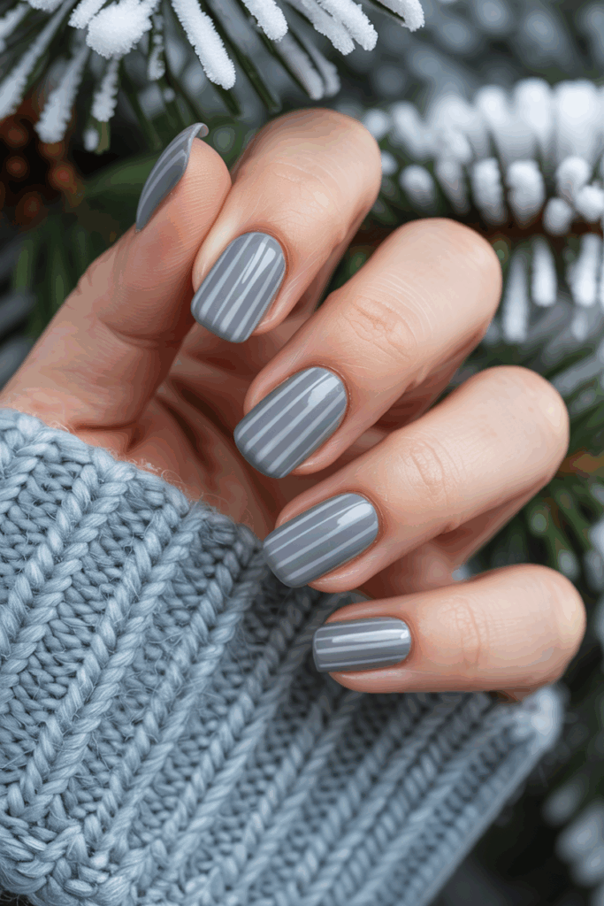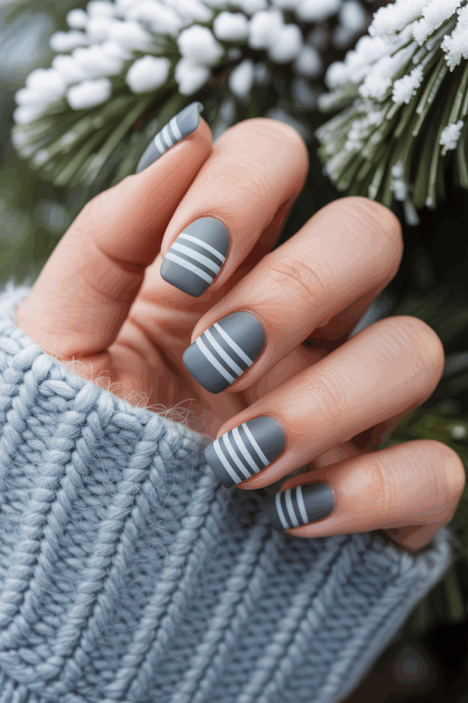This design pairs a soft matte frost gray base with sharp glossy stripes. The contrast creates a clean, modern look that feels fresh for winter. It works well for those who want a subtle nail style with a touch of shine.