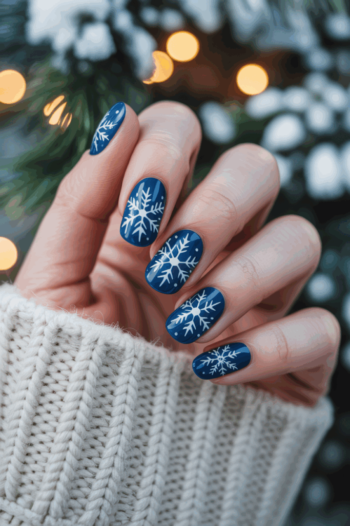 This nail design uses a deep midnight blue as the base color. Snowflake stencils in white or silver are added on top for a crisp, winter look. It works well on both short and long nails. The contrast between the dark blue and bright snowflakes creates a clean, elegant style.