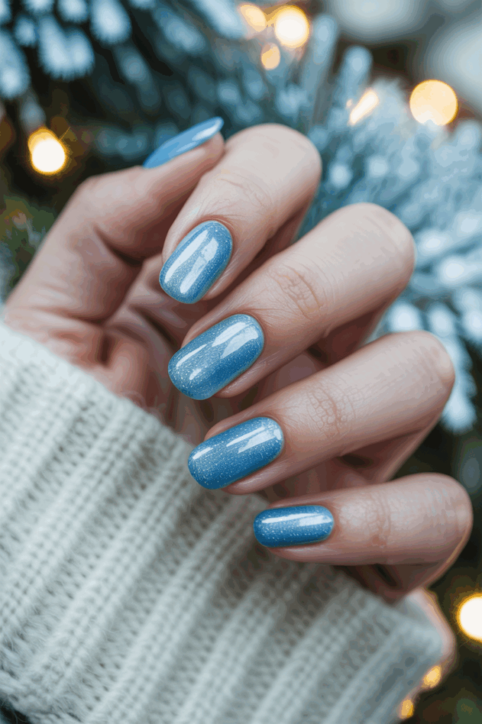 Shimmering ice blue nails bring a cool, elegant look for winter 2025. The soft blue shade pairs well with glitter or metallic accents. This style suits both simple and festive occasions, adding a subtle shine that captures the season’s crisp, frosty feeling.