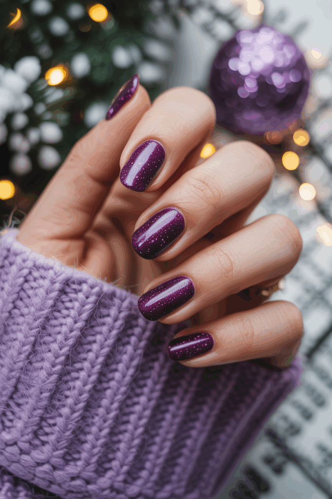 This design features a deep, smoky purple base that looks both bold and elegant. Small sparkles add a touch of shine without overwhelming the look. It works well for winter nights and special occasions. The sparkle catches light, giving nails a subtle festive feel.
