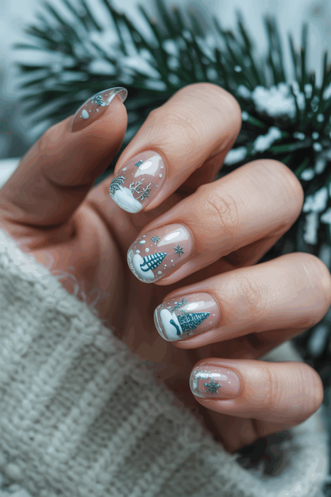 This design uses clear polish to create a glass-like look on the nails. Small glitter or tiny decorations are added inside, mimicking a snow globe. It offers a simple, elegant winter style that fits well with festive themes.