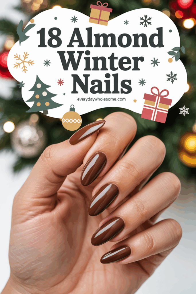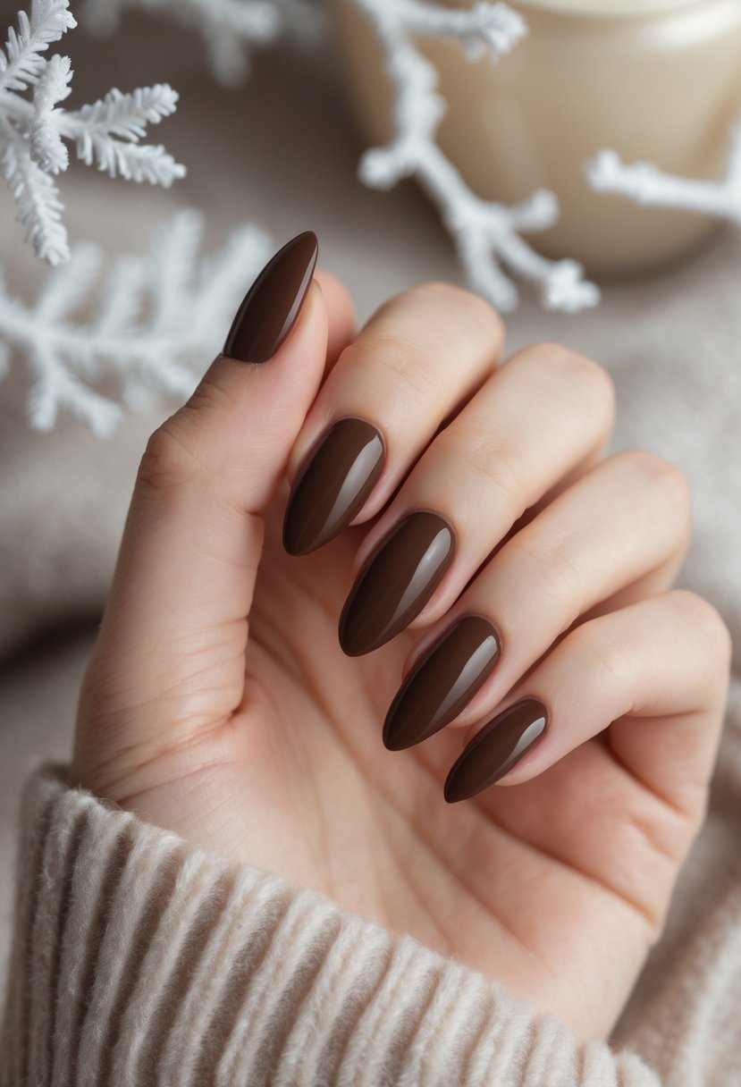 Chocolate brown almond nails offer a warm, rich color ideal for winter. The deep tones add elegance without being too bold.