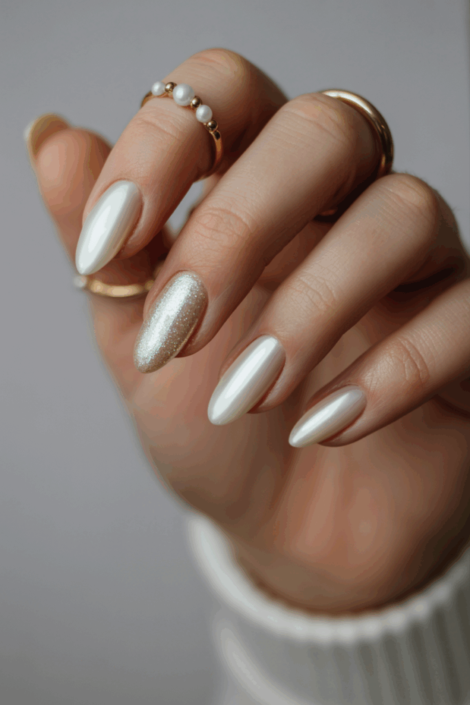Pearl white almond nails offer a clean and simple look for winter. The soft shimmer adds a subtle shine without being flashy. This style works well with casual and formal outfits alike.