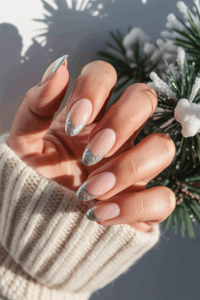 Glittery silver tips add a subtle sparkle to almond-shaped nails. This style pairs a neutral base with shimmering silver at the tips for a clean, elegant look.