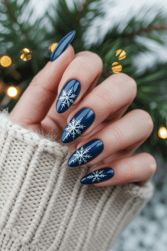 Navy blue almond nails offer a sleek and elegant look for winter. The deep blue base creates a rich, calming effect. Snowflake accents add a delicate, seasonal touch without overwhelming the design. This style works well for both casual and formal occasions.