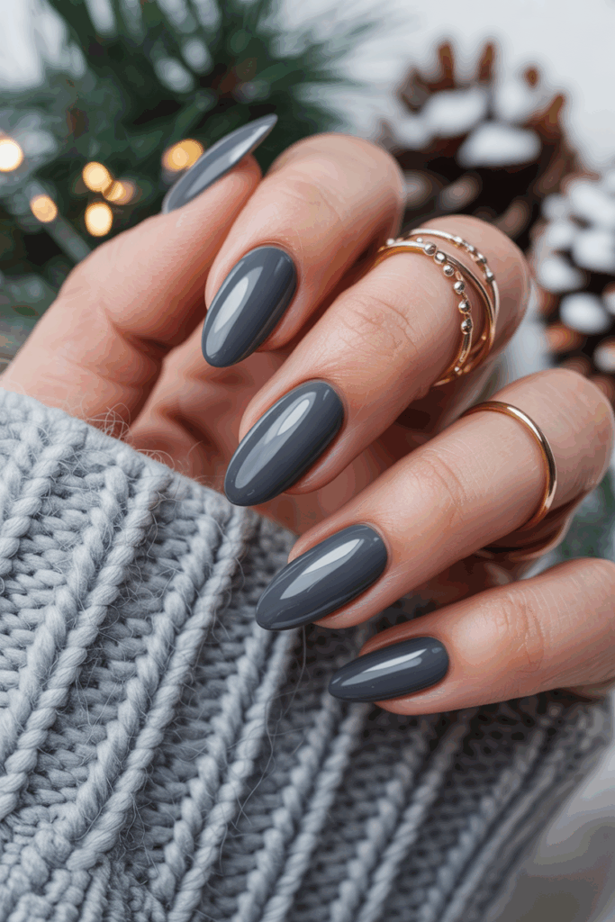 Charcoal grey is a strong, neutral color that suits the almond nail shape well. It gives a modern and clean look without being too bright.