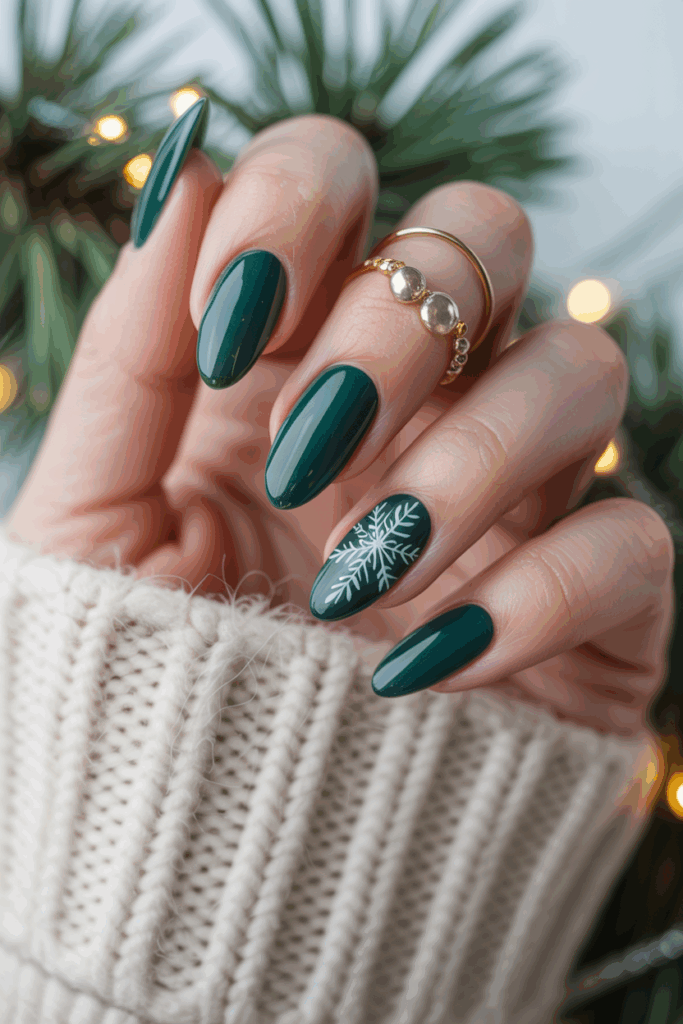 Dark green almond nails bring a bold but classic look. They work well in winter, matching both casual and formal outfits. The deep green shade adds a touch of elegance without being too flashy. They are a practical choice for those wanting a stylish but subtle manicure.