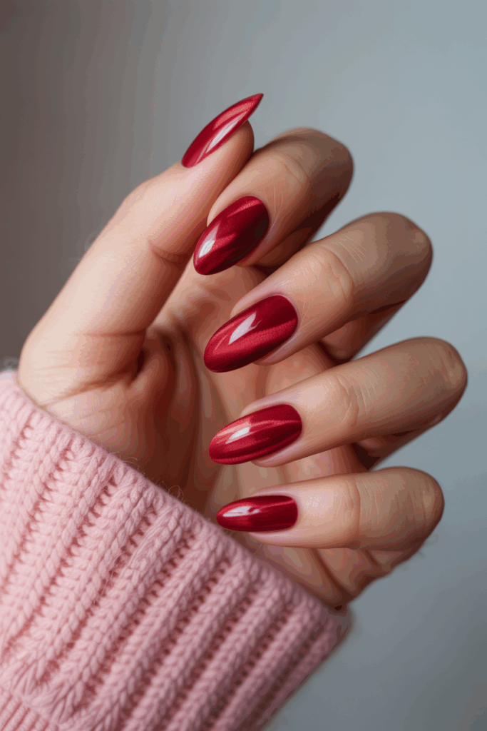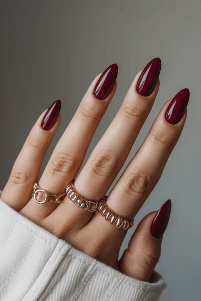 Deep burgundy almond nails offer a rich and elegant look for winter. The shape complements the dark, bold color, creating a classy style.