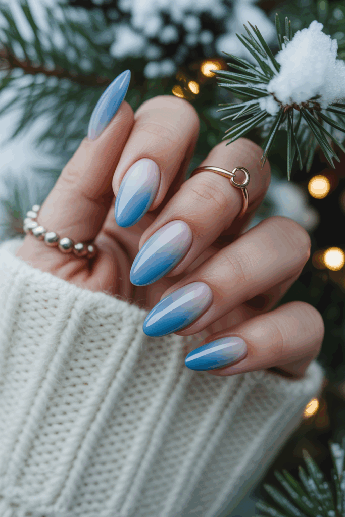 Icy blue ombre nails blend pale and deeper blue tones smoothly. This style highlights the almond shape’s elegance with a cool, wintery feel. It suits both casual and formal occasions. The gradient effect adds a subtle, stylish dimension without being too bold.
