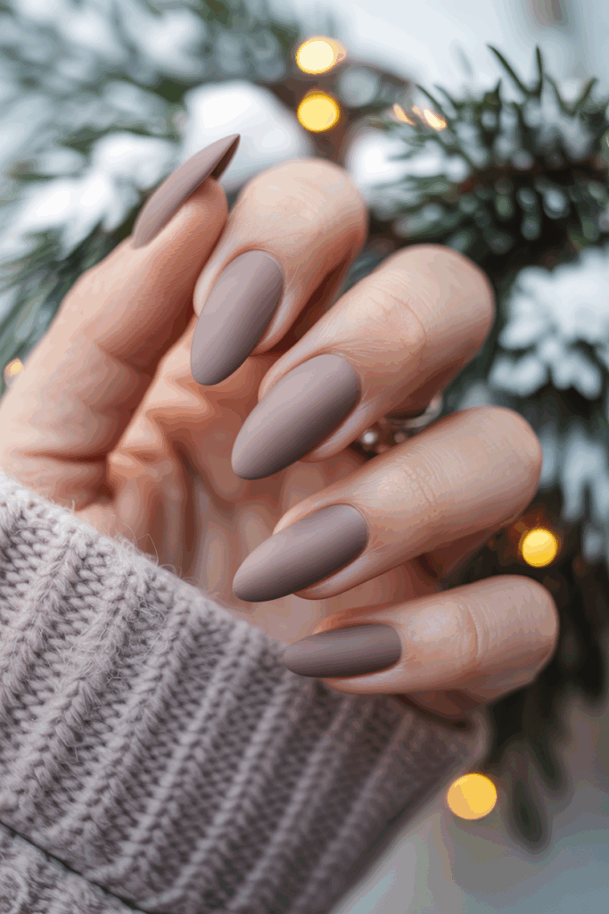 Matte taupe almond nails offer a simple, elegant look for winter. The muted color pairs well with the soft shape, creating a cozy yet polished style.