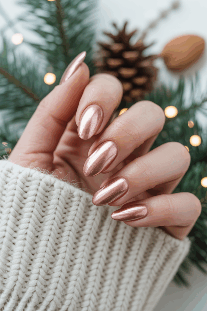 Metallic rose gold on almond nails offers a soft, elegant shine. This look works well with both neutral and darker base colors. It adds a modern twist while keeping the nails sophisticated and stylish.