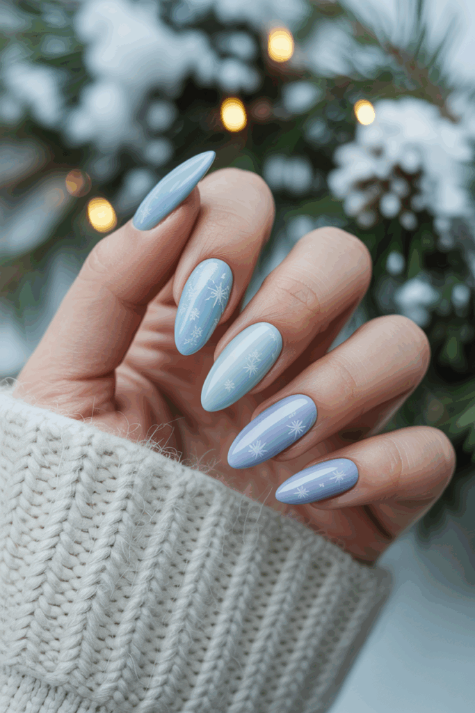 Almond-shaped nails in icy pastel blue offer a cool and elegant winter look. The soft blue tone reflects the calm of snowy days.