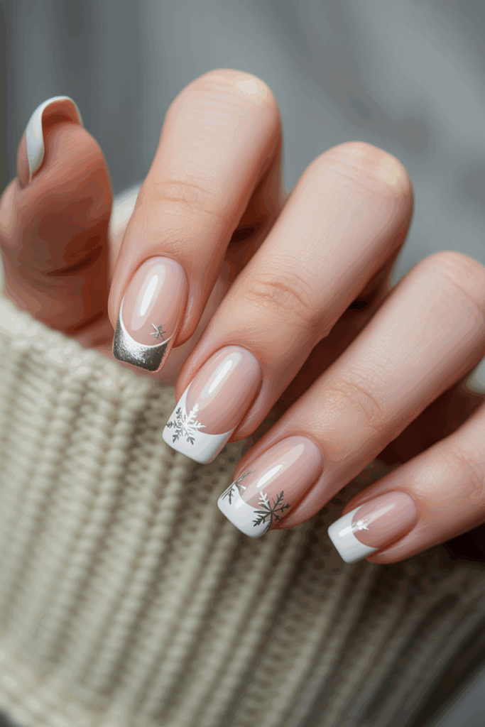 1) Classic French Tips with Silver Snowflake Accents