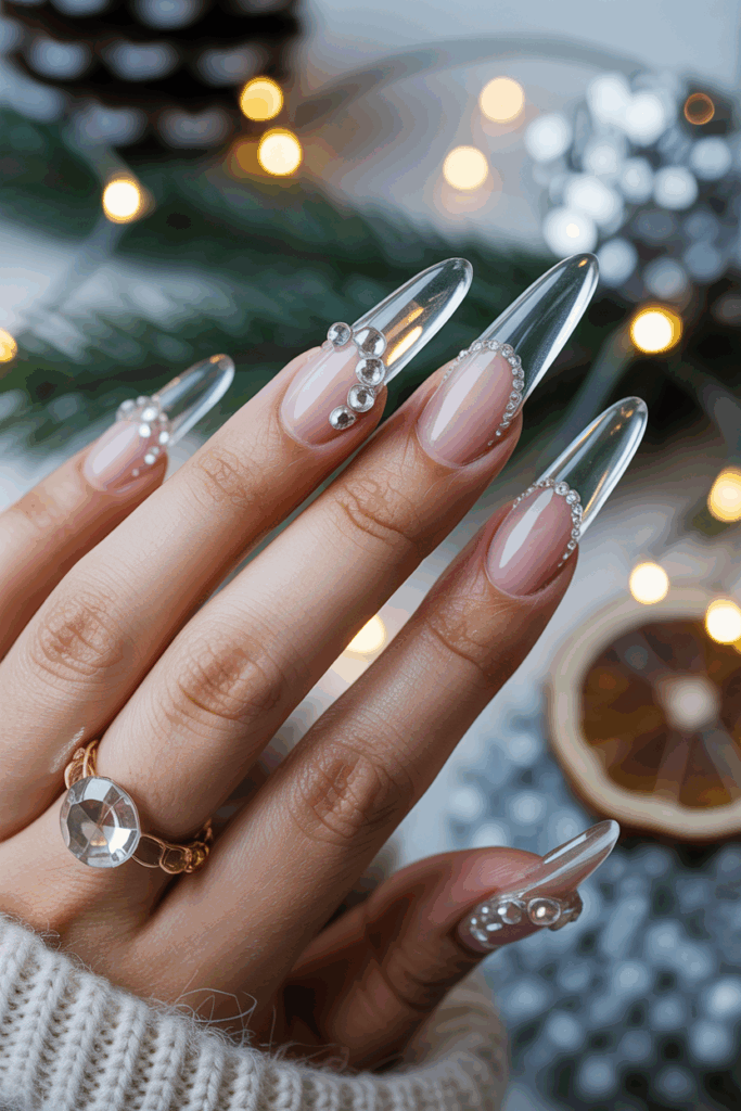 Crystal-embellished clear acrylic nails offer a sparkling, winter-ready look. The clear base allows the crystals to shine, adding a subtle yet eye-catching detail.