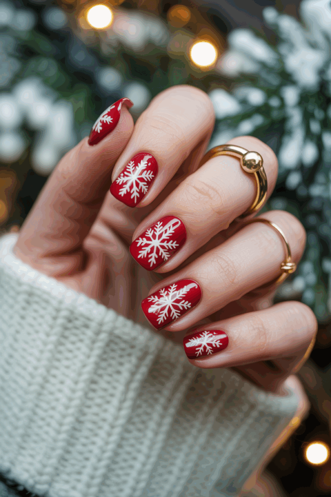 This nail design pairs bold red polish with white snowflake patterns. The contrast between the colors offers a clear, festive look suitable for winter.
