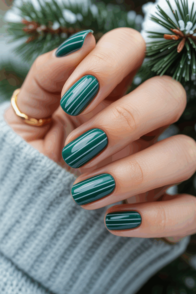 This look features shiny emerald green nails paired with simple, clean lines. The gloss adds a refined shine that highlights the rich color.