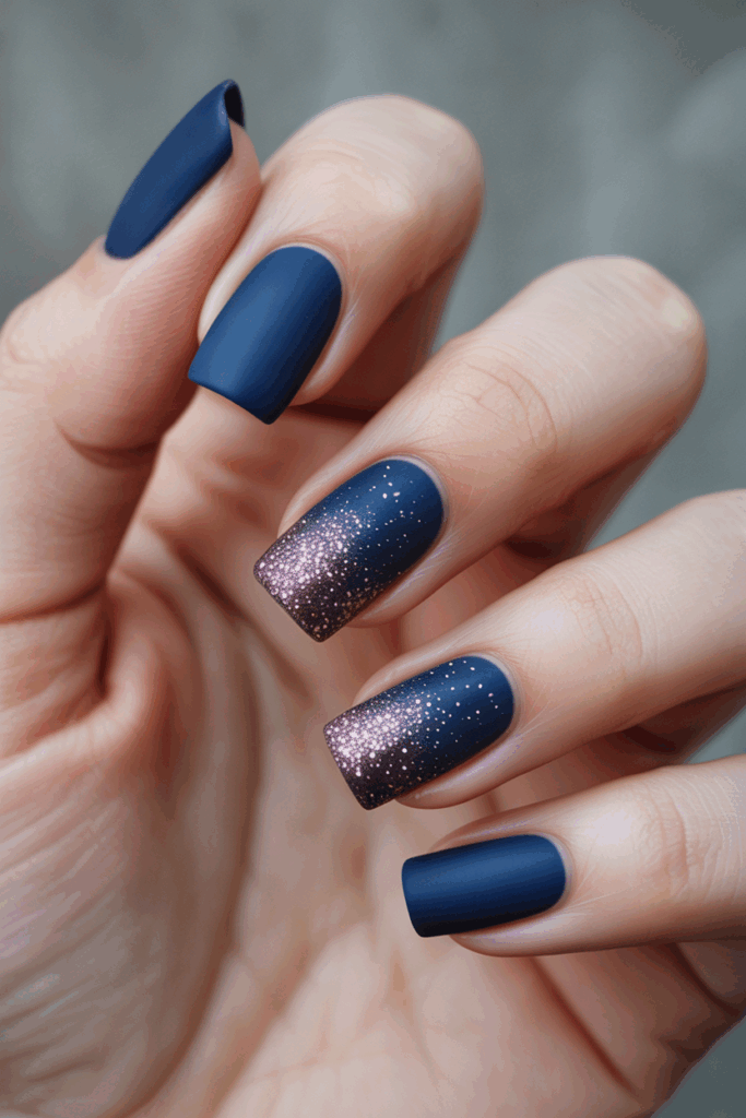 This nail design pairs a deep matte navy blue base with a subtle glitter gradient. The matte finish adds a smooth, modern look that contrasts well with sparkling glitter.