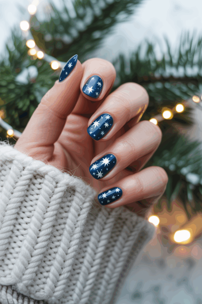 Delicate white snowflake or frost designs often complement this look. It adds a subtle seasonal touch without being too bold.