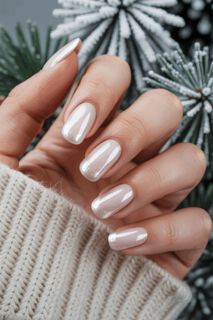 The tips have a frosted effect, giving a soft, icy look. This contrast makes the nails feel fresh and perfect for winter.
