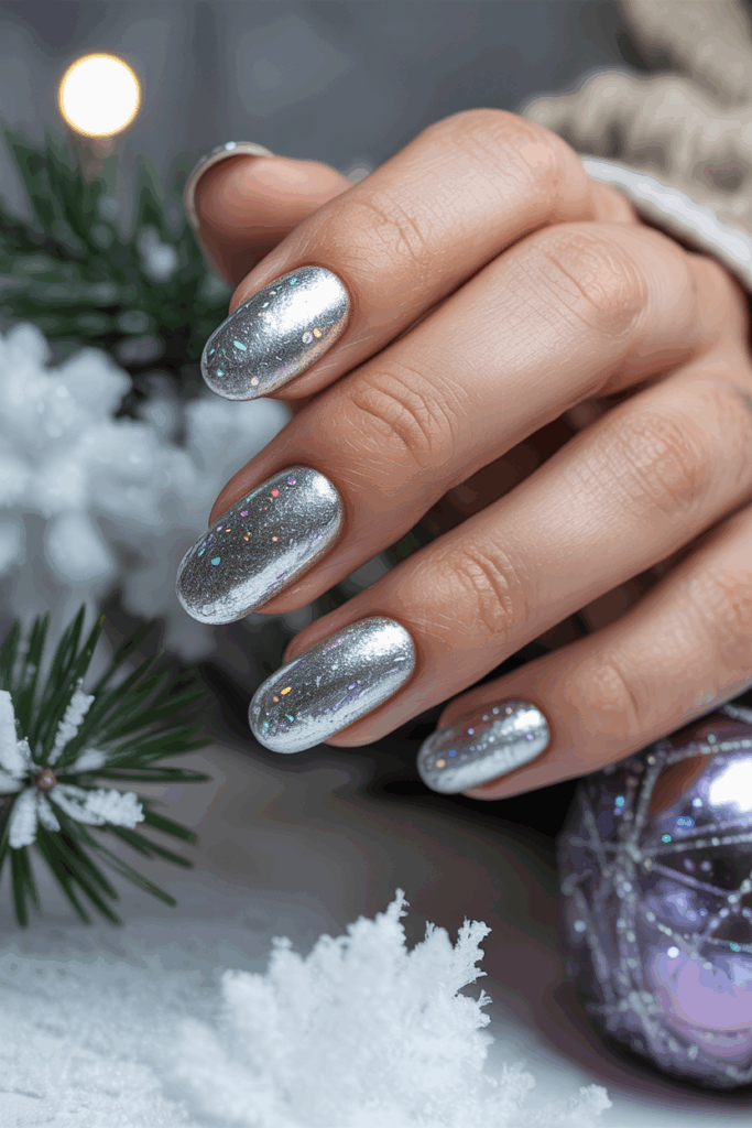 Silver snowflake patterns are added on one or two accent nails. These details bring a subtle winter touch without overwhelming the look.