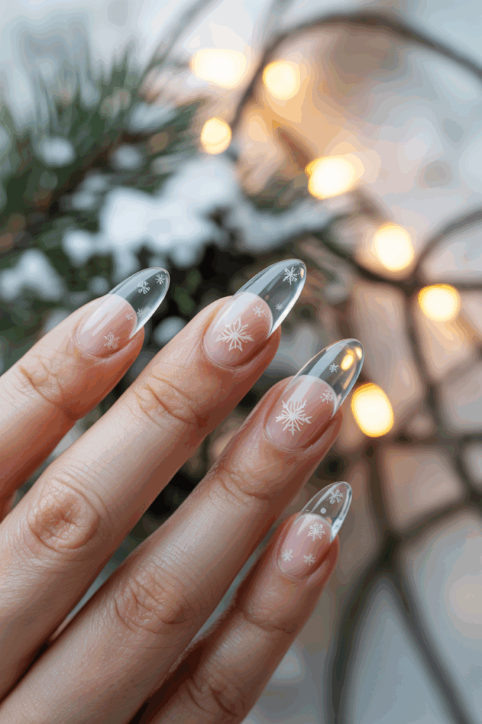 The transparent style highlights the snowflakes without heavy colors. It suits those who want a subtle but seasonal nail design. It works well for both short and long nails.