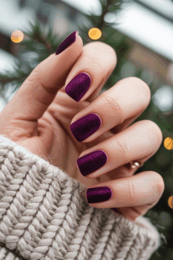 Velvet textured nails offer a soft, plush look that fits winter well. Dark plum is a rich shade that adds depth and warmth to the design.