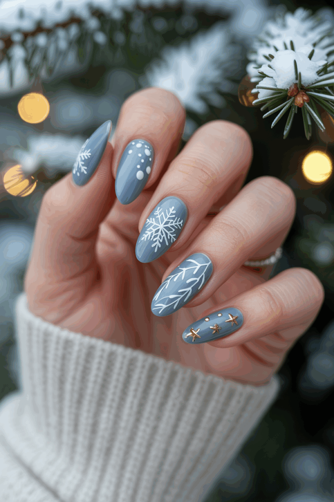 Frosty blue nails create a cool, wintery look. Adding silver glitter highlights brings a subtle sparkle. This combination suits both simple and festive styles. It works well on short or long nails for a sleek, seasonal finish.
