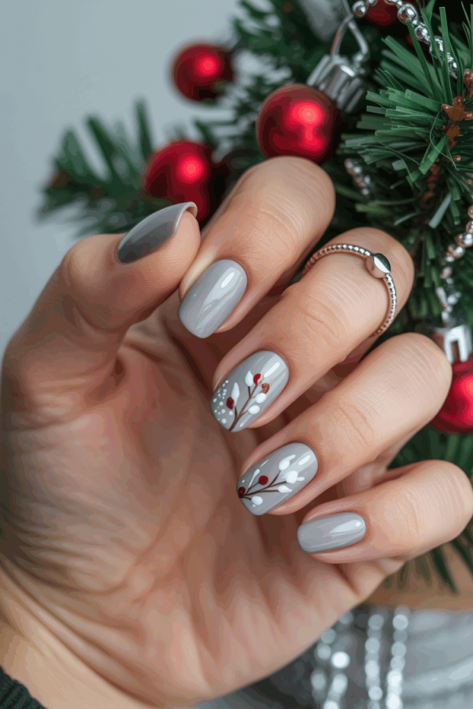 Light grey nails provide a soft, neutral base that highlights delicate winter floral patterns. These designs often include small white or silver flowers, adding a subtle seasonal touch.