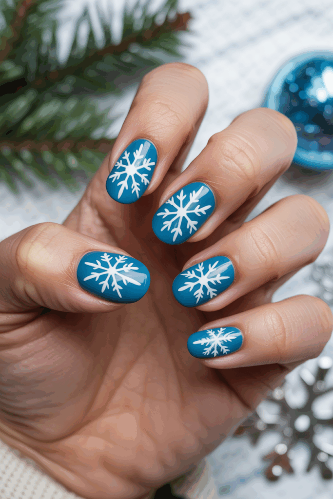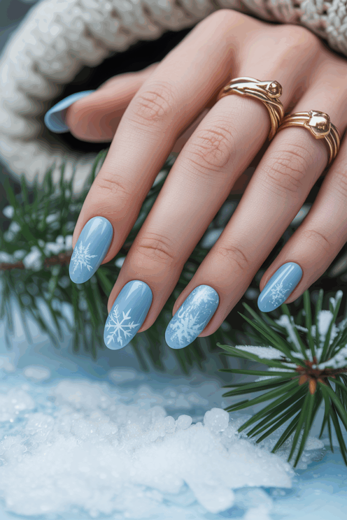 Icy blue nails reflect the cold, clear beauty of winter. They often feature soft blue shades paired with white or silver details that mimic snowflakes.