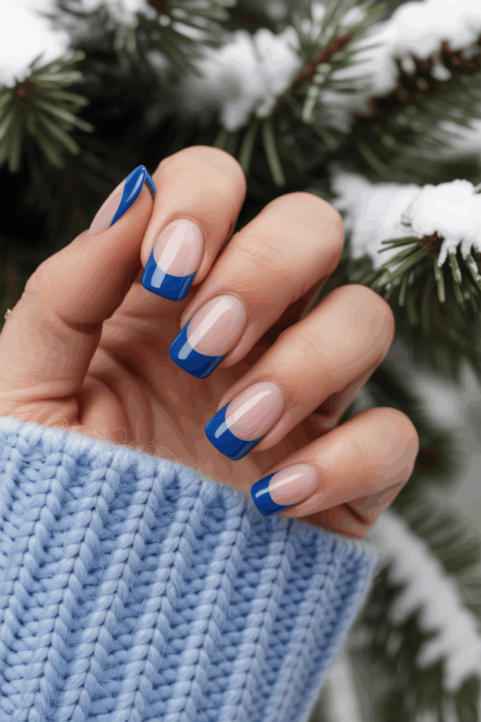 Bold French tips in cobalt blue add a strong, modern touch to winter nails. The deep blue color stands out well against lighter nail bases. This style fits both casual and formal looks, making it versatile for the winter season.